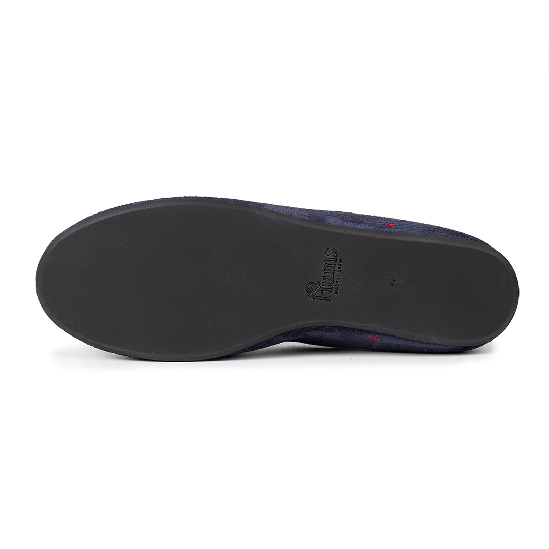 Loafers i blå mocka med röda kors. Med sitt mjuka foder i fuskpäls och en bra yttersula, blir de ett perfekt val för allt från mysiga hemmakvällar och långa frukostar till en avslappnad promenad på stan eller drinken med vänner.