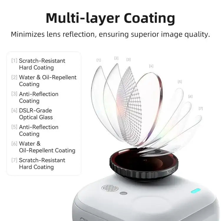 För att leverera en bildkvalitet i världsklass använder filtret optiskt glas av kamerakvalitet med flerlagersbeläggning.