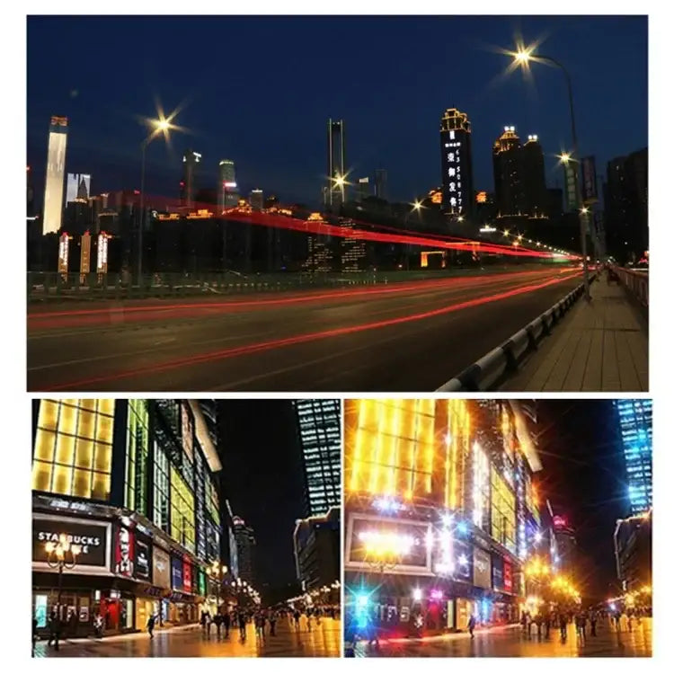 Detta filter är designat för att skapa ett stjärnformat mönster av ljuskällor i dina bilder. Oavsett om du fotograferar stadens ljus på kvällen, gatlyktor, bilstrålkastare, solens reflektion i vatten eller gnistrande julbelysning, förvandlas varje ljuspunkt till en strålande stjärna.