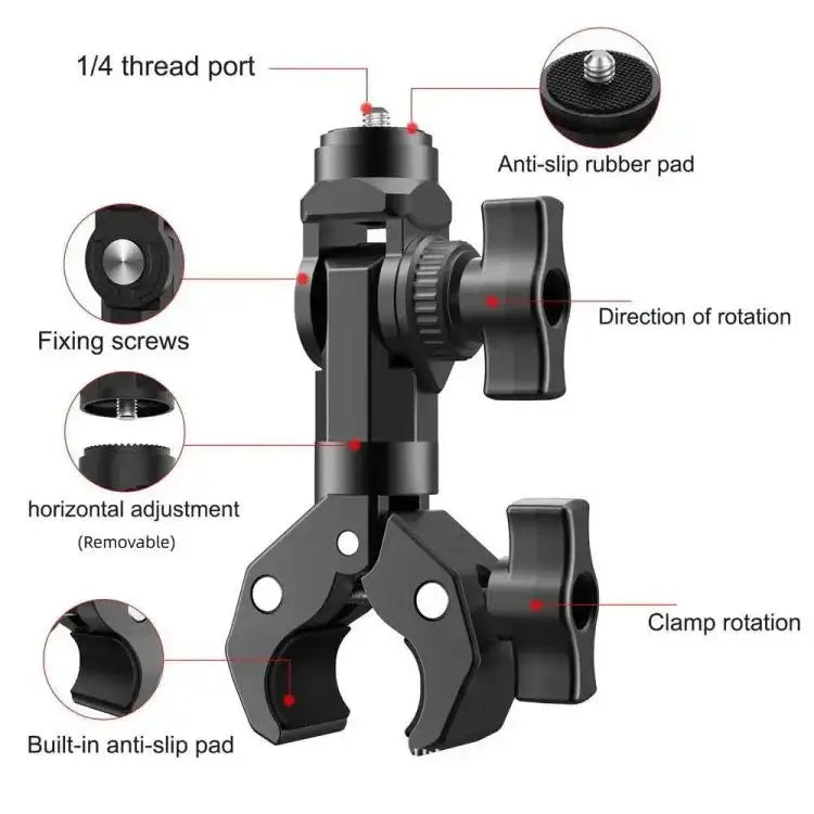 Denna multifunktionella Camera Clip Motorcycle Bicycle Handlebar Crab Clamp är utvecklad för dig som vill fånga actionfyllda ögonblick från motorcykelns styrstång, cykelns styre eller valfri utomhusmiljö. Oavsett om du kör längs slingriga bergsvägar, pendlar på stadsgator eller filmar från räcken och stolpar, gör detta robusta fäste det enkelt att skapa stabila och dynamiska actionshots.