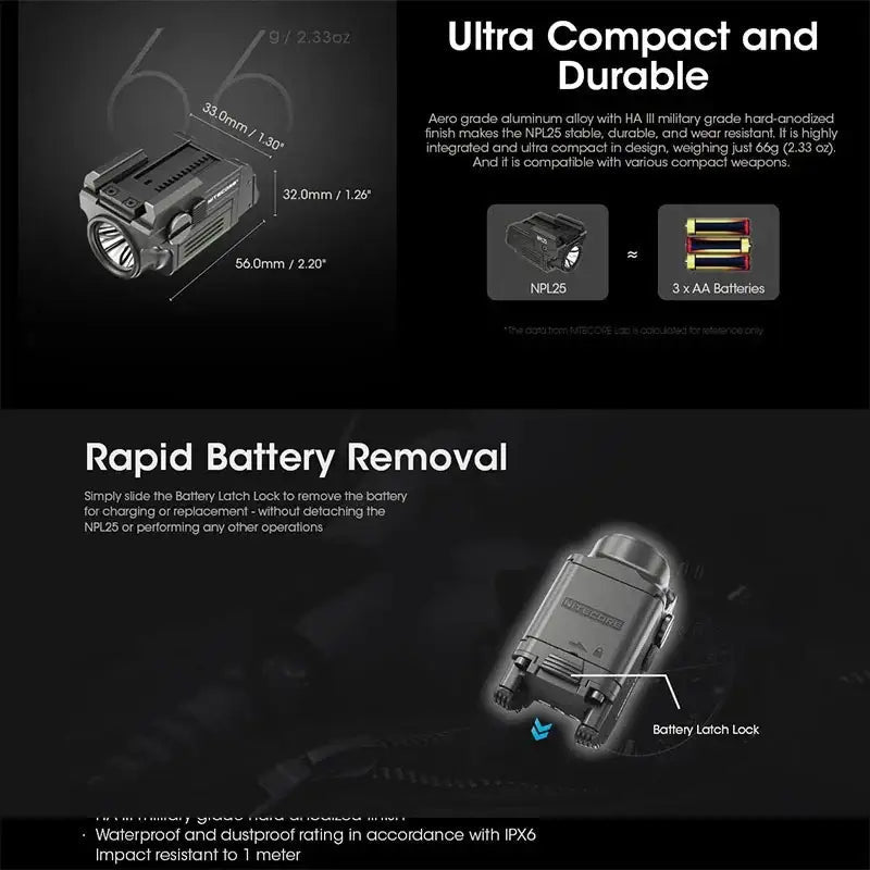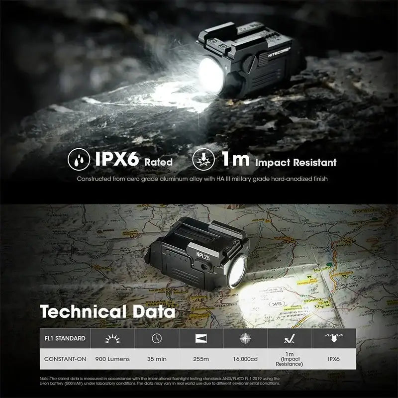 Nitecore NPL25 ficklampa är en kompakt men extremt kraftfull taktisk belysning utvecklad för Picatinny- och Glock-skenor.
