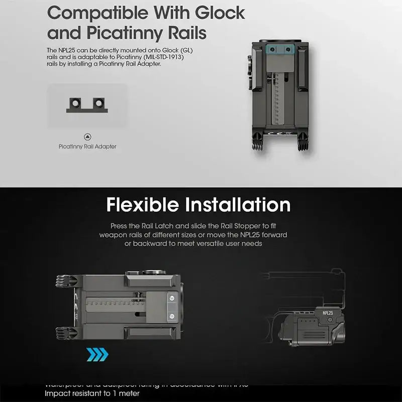 Nitecore NPL25 är kompatibel med både Picatinny (MIL-STD-1913) och Glock-skenor (GL), och rätt adapter ingår i förpackningen.