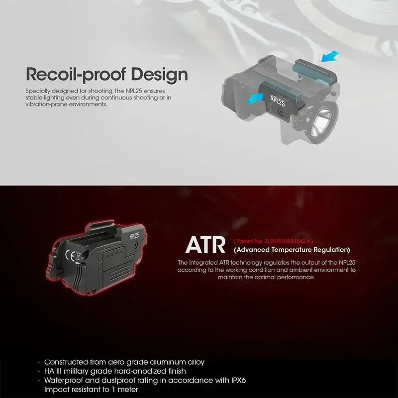 Detta gör NPL25 till en professionell ficklampa för polis, militär, säkerhetspersonal och sportskyttar som kräver ett robust, tillförlitligt och taktiskt belysningsverktyg.