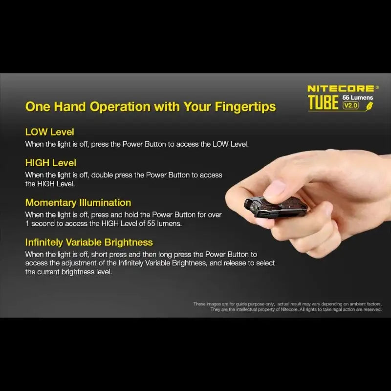 En unik funktion med Nitecore TUBE V2.0 är att ljusstyrkan är fritt justerbar. Genom att hålla ned knappen kan du finjustera ljusnivån mellan 1 och 55 lumen, beroende på behov. Du kan exempelvis välja låg effekt för att spara batteri vid nattbruk, eller aktivera maxläge för att lysa upp större områden.