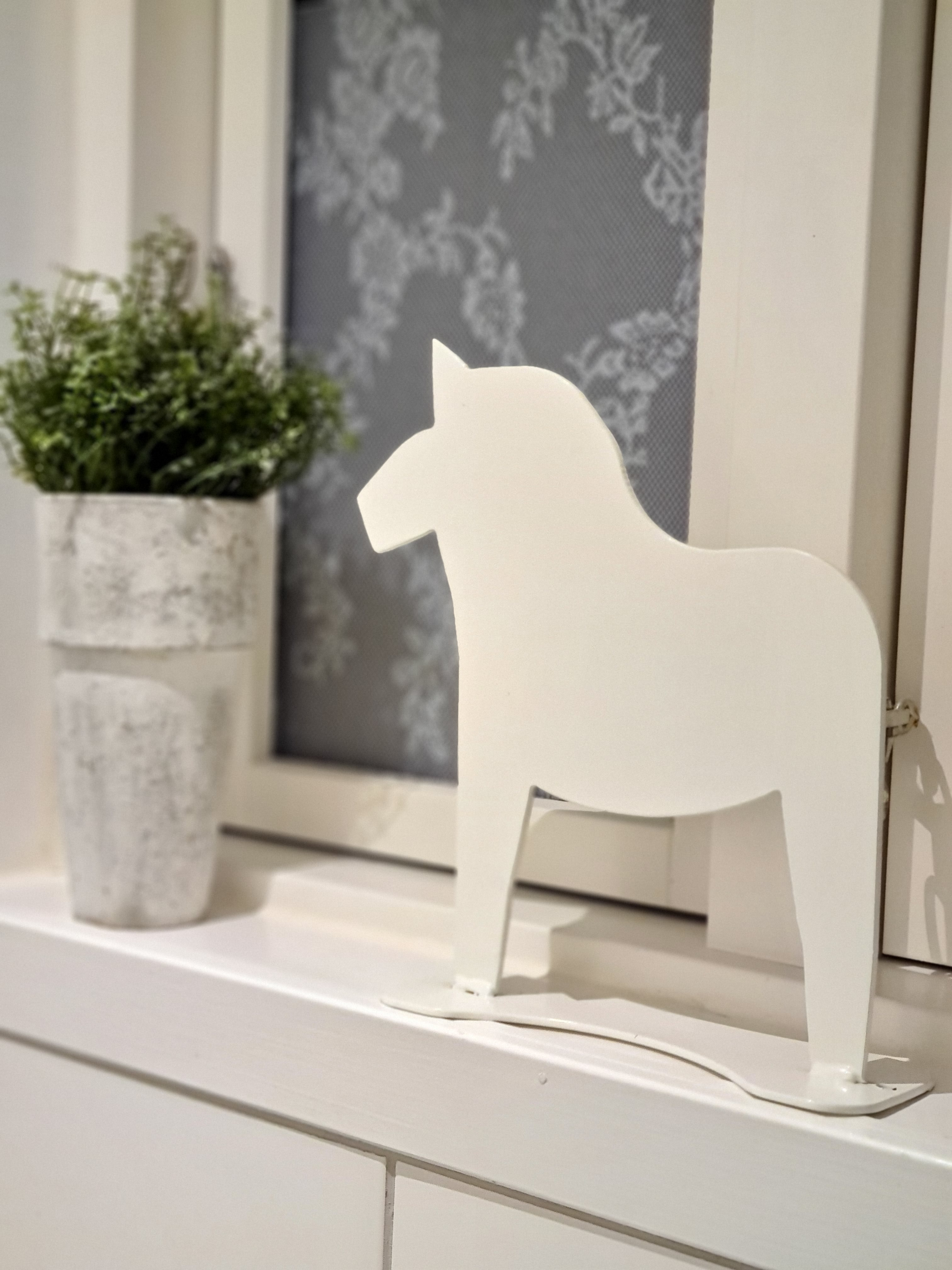 Sedan tidigt 1600-tal har dalahästen blivit en av de vanligaste symbolerna för Sverige i allmänhet och Dalarna i synnerhet. Nu kan du få din alldeles egna dalahäst i plåt! Kan exempelvis placeras på köksbordet, fönsterkarmen eller i vardagsrummet. Finns även i färgen svart.