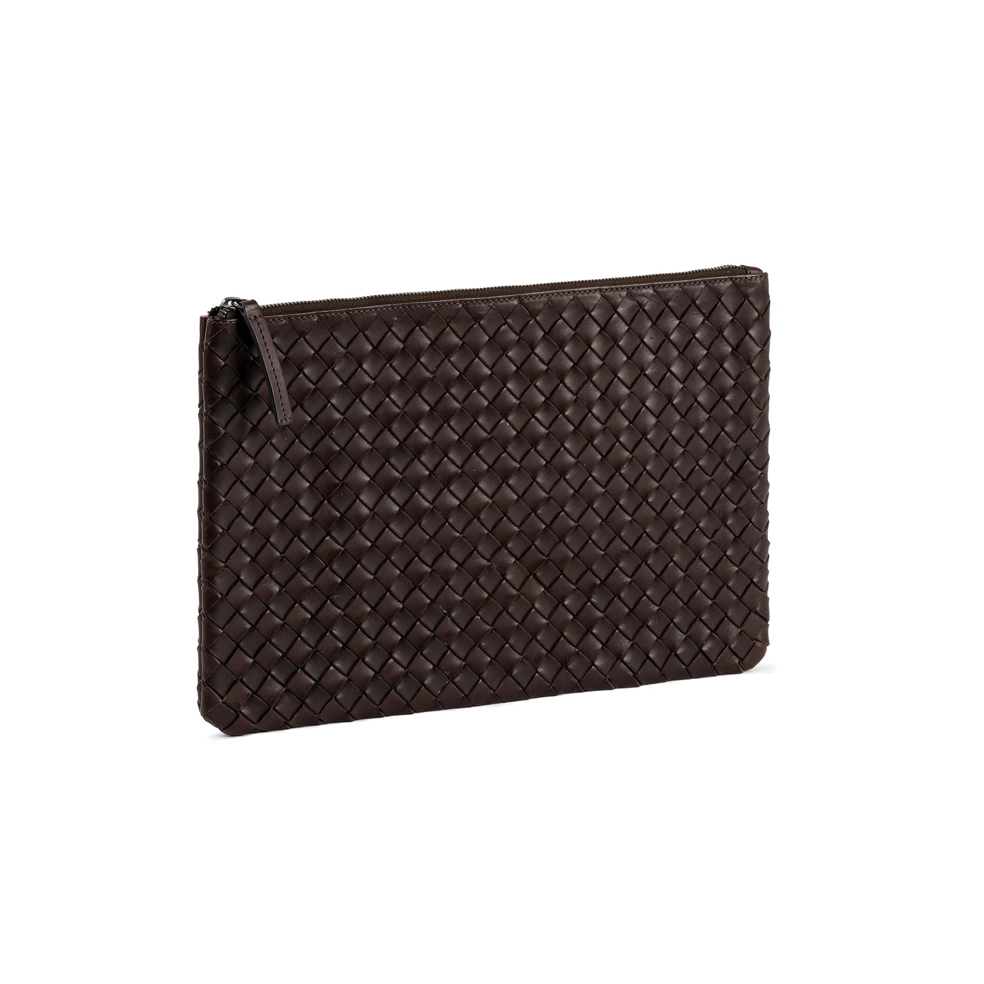 Elegant och funktionell datorväska i handflätat läder som ger ditt dagliga arbetsmaterial en personlig prägel. En extra ficka på insidan rymmer laddare och mindre papper. Det vegetabiliskt garvade, anilinfärgade narvlädret åldras naturligt med tiden och kommer att variera i färg och ytstruktur.